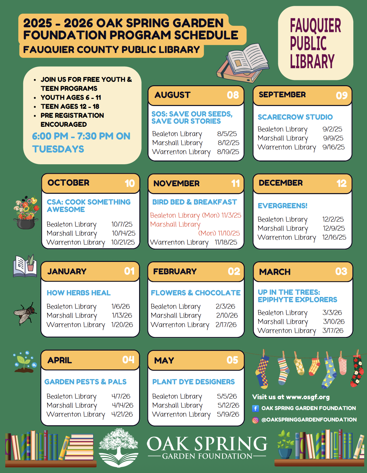 Oak Spring Garden Foundation offers free programs for local public school students and youth/senior citizen organizations and clubs. Contact us to schedule your 2025-2026 programs beginning February 1, 2025. We also offer free youth and teen programs at our local Fauquier Public Library locations. View the list below to see all of these upcoming opportunities.